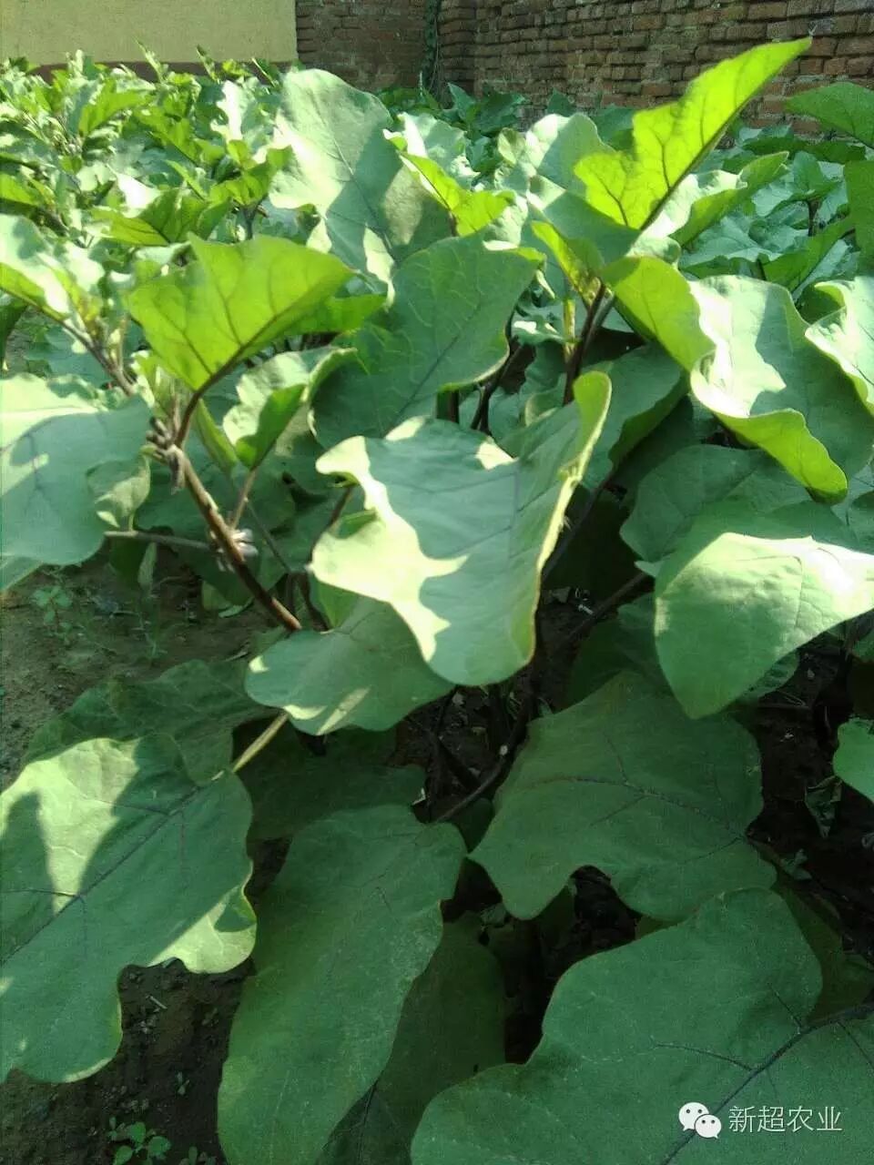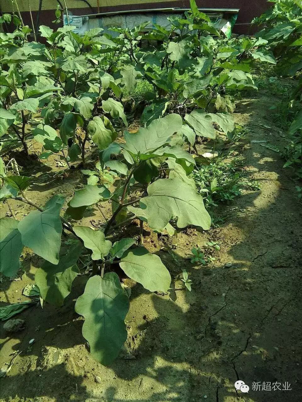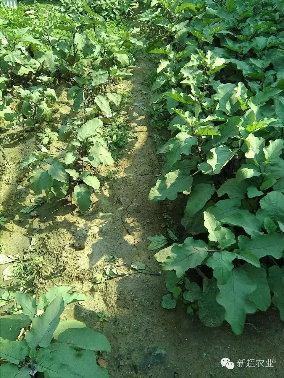 左边没有用菌肥的茄子植株矮 小,叶色发黄,叶片大小不一,个个无精打彩。右边用新超公司微生物菌肥的茄子,植株健壮,叶色深绿,叶片均匀,个个精神抖擞,神气十足。